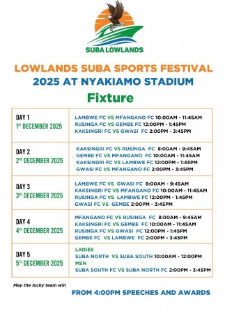 This year's Lowlands Suba Festival will be held at Nyakiamo Stadium in Sindo Township from December 1 to December 5, 2025. The event will feature men's and women's soccer matches. Teams from Lambwe, Rusinga, Gembe, Kasingri, Mfangano and Gwasi will participate in the men's soccer competition. The ladies' soccer match will be between Suba North and Suba South constituencies. The finals will be played on December 5.